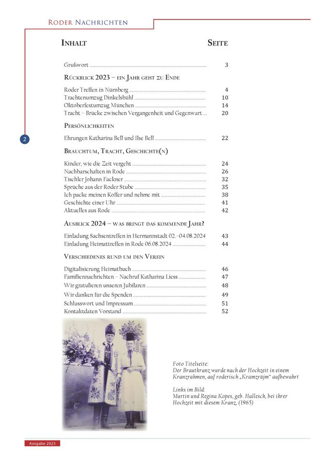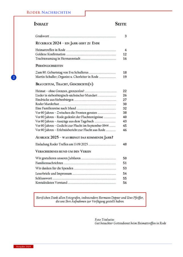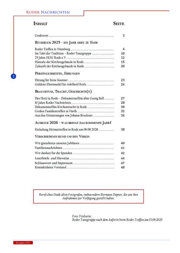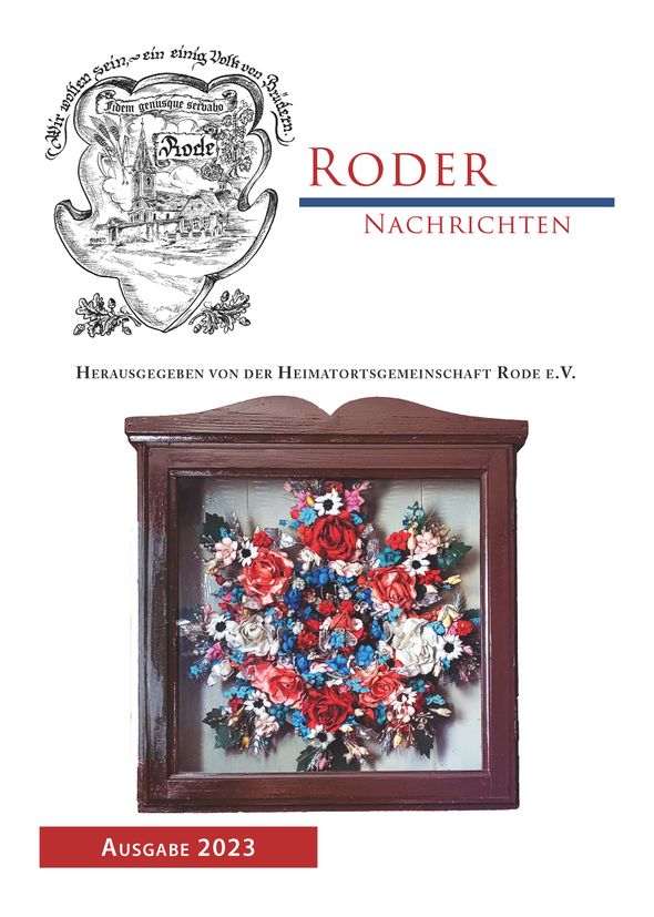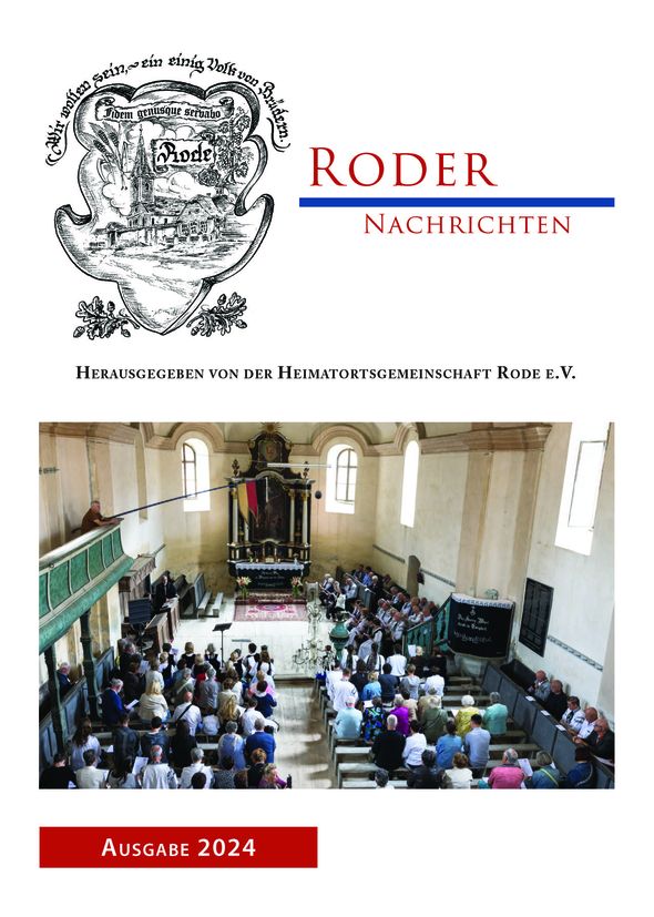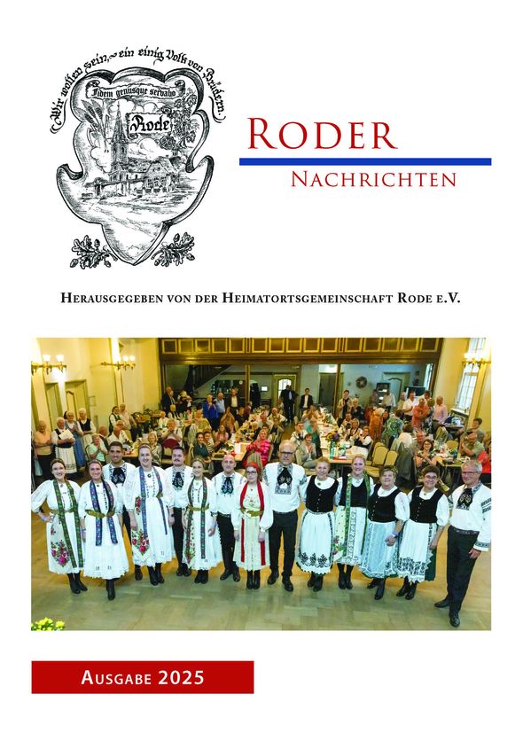 Das Informationsheft “Roder Nachrichten” erscheint jedes Jahr zu Weihnachten in einer Auflage von 300 Exemplaren. Es ist nur für einen engen Personenkreis bestimmt. Mitglieder der HOG Rode e.V. erhalten es kostenlos. Aus datenschutzrechtlichen Gründen können wir die Hefte hier nicht komplett veröffentlichen – lediglich die Titelseite und das Inhaltsverzeichnis der jeweiligen Ausgabe. Restexemplare der verschiedenen Jahrgänge werden gegen einen Unkostenbeitrag an Interessierte gerne abgegeben. Anfragen bitte an Heidrun Depner (Email: Depner.Heidrun@t-online.de)